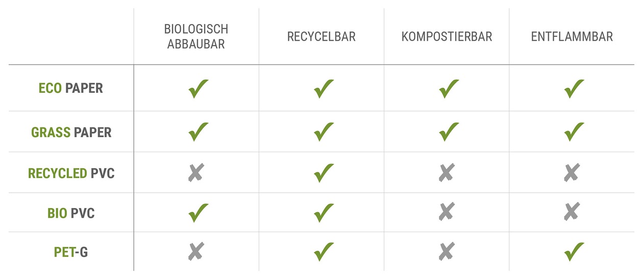 Graspapier wird aus verarbeitetem Gras hergestellt - es ist noch umweltfreundlicher als reines Recyclingpapier und Papier aus Primärfaserstoffen. Somit ist es ein biologisch abbaubares und kompostierbares Material.